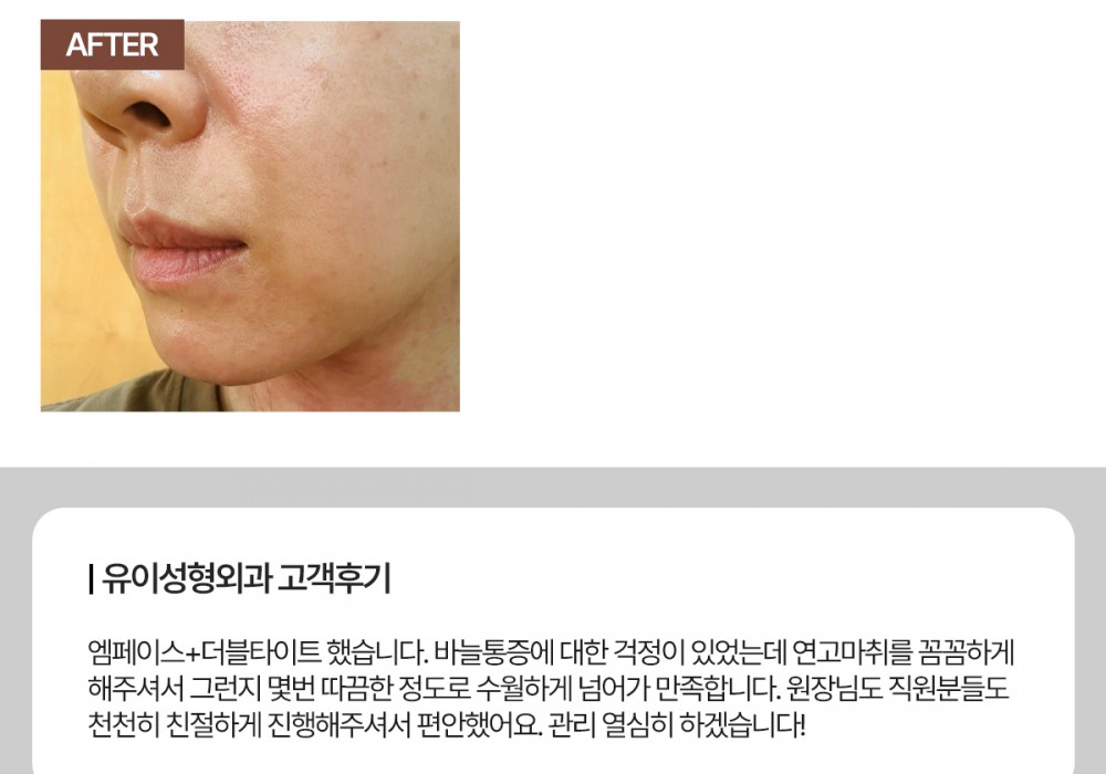'수술 후 출혈, 감염, 염증 등의 합병증이 있을 수 있으며 주관적인 만족도는 개인마다 차이가 있을 수 있으므로 의사와 상의하시기 바랍니다.'