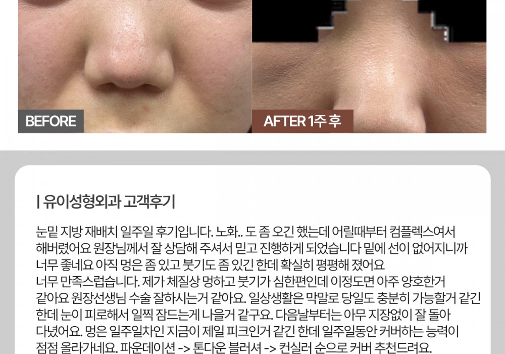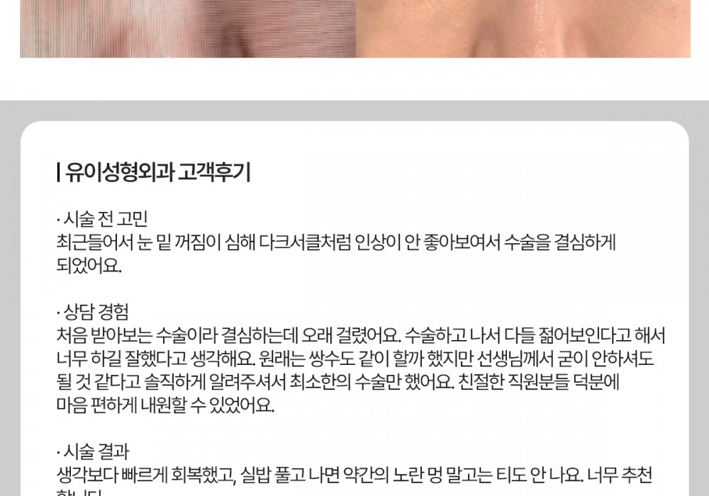 '수술 후 출혈, 감염, 염증 등의 합병증이 있을 수 있으며 주관적인 만족도는 개인마다 차이가 있을 수 있으므로 의사와 상의하시기 바랍니다.'