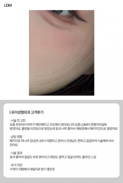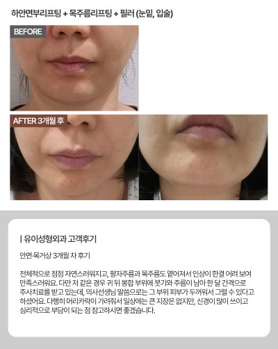 | 개선부위 | 리프팅, 타이트닝, 윤곽개선 | 미세 주름 감소, 탄력개선 |