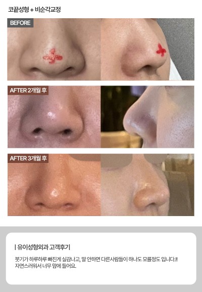 귀연골, 비중격연골, 늑연골 등 자가 연골 이용하여 콧대나 코끝 등에 부작용은 줄이고 입체적이고 자연스러운 코 라인 연출