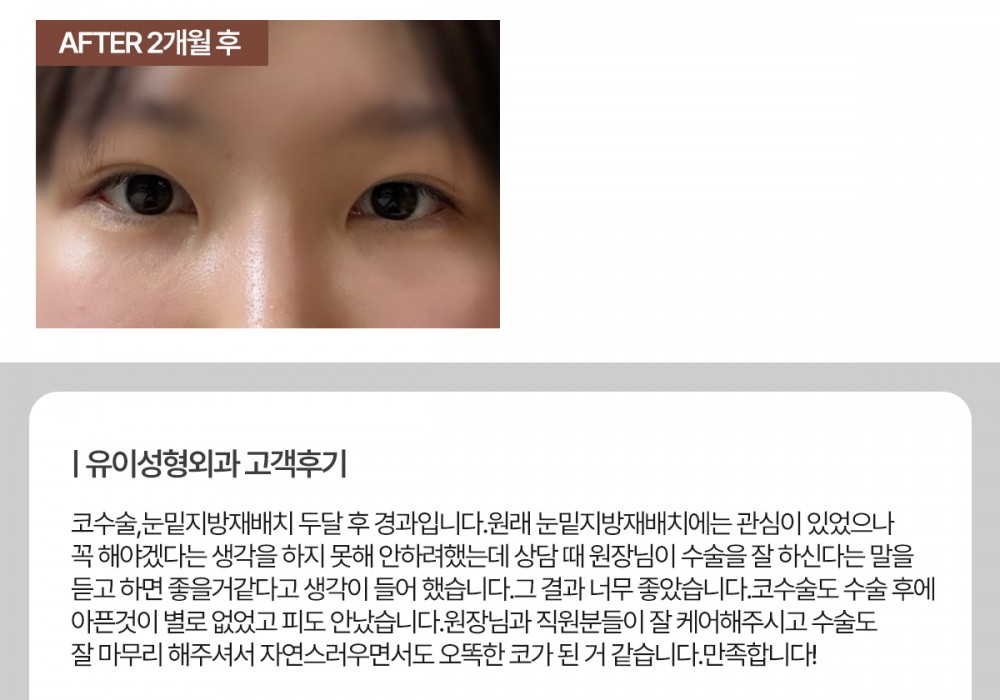 '수술 후 출혈, 감염, 염증 등의 합병증이 있을 수 있으며 주관적인 만족도는 개인마다 차이가 있을 수 있으므로 의사와 상의하시기 바랍니다.'