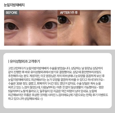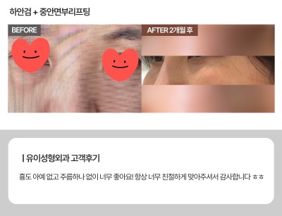 | 수술흉터 | 눈썹 라인 따라 거의 보이지 않음 | 쌍꺼풀 흉터와 비슷 |